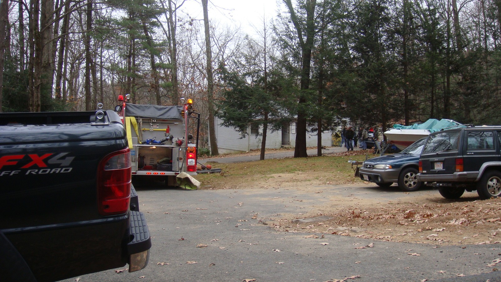 Beside the fire engine shown, three fire fighters arrived on the scene in their private cars equipped with emergency lights.