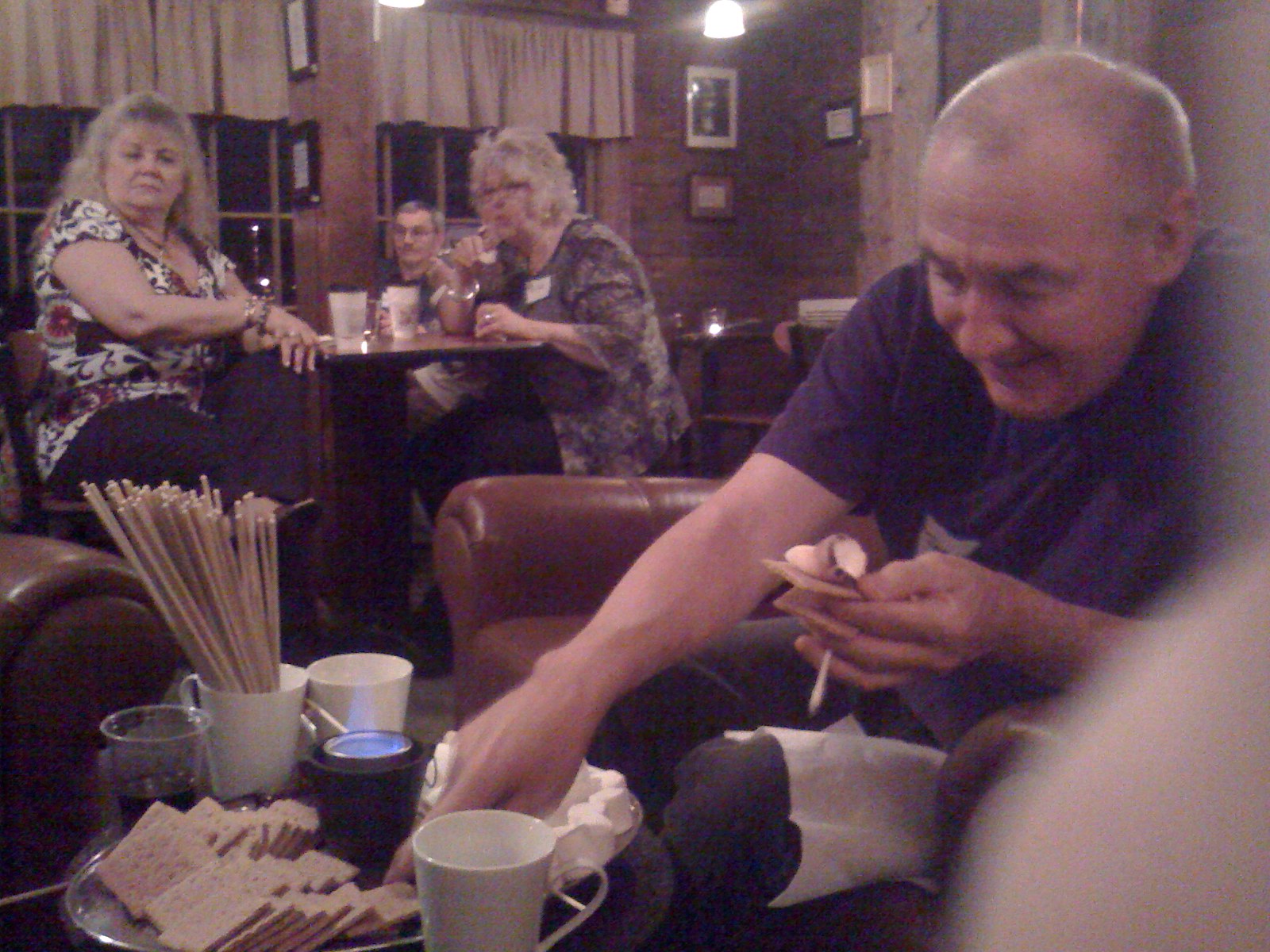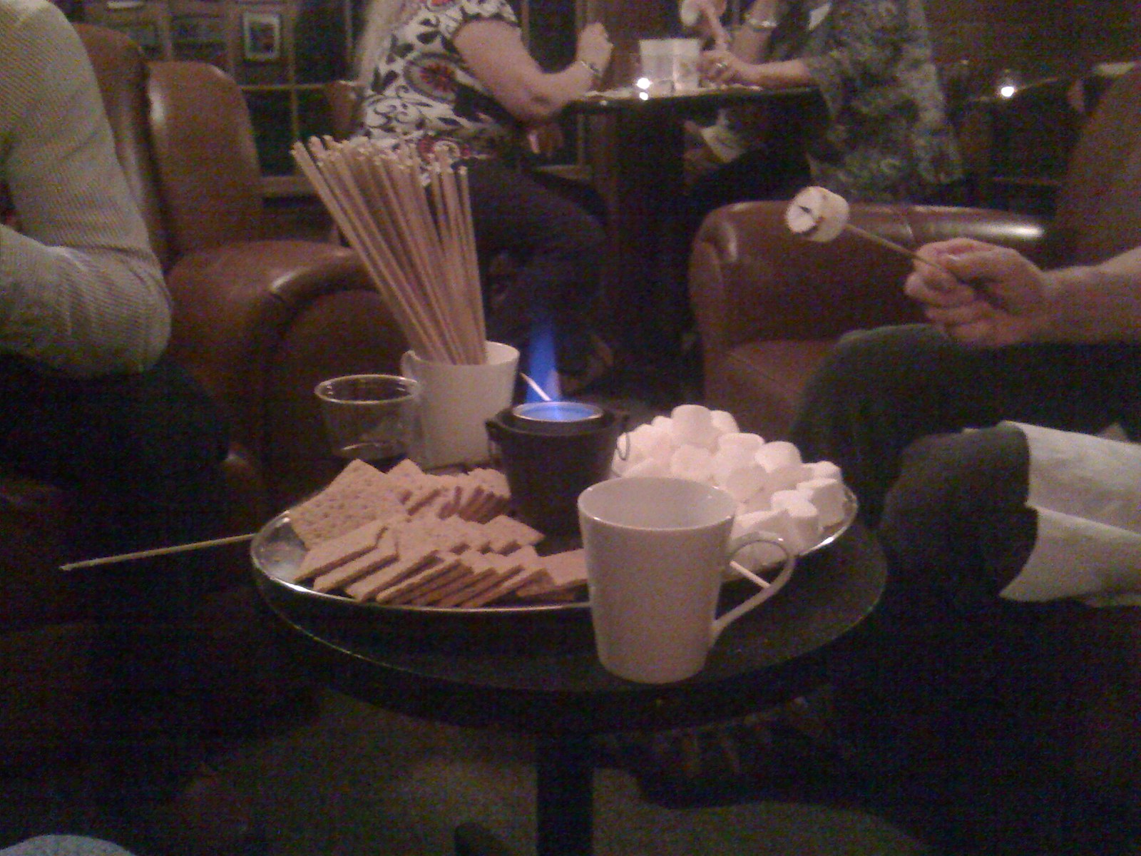 A buffet with chocolate dipped strawberries, veggies, crackers and other snacks were offered; some tables had small burners to grill marshmallows and all the ingredients to make smores.