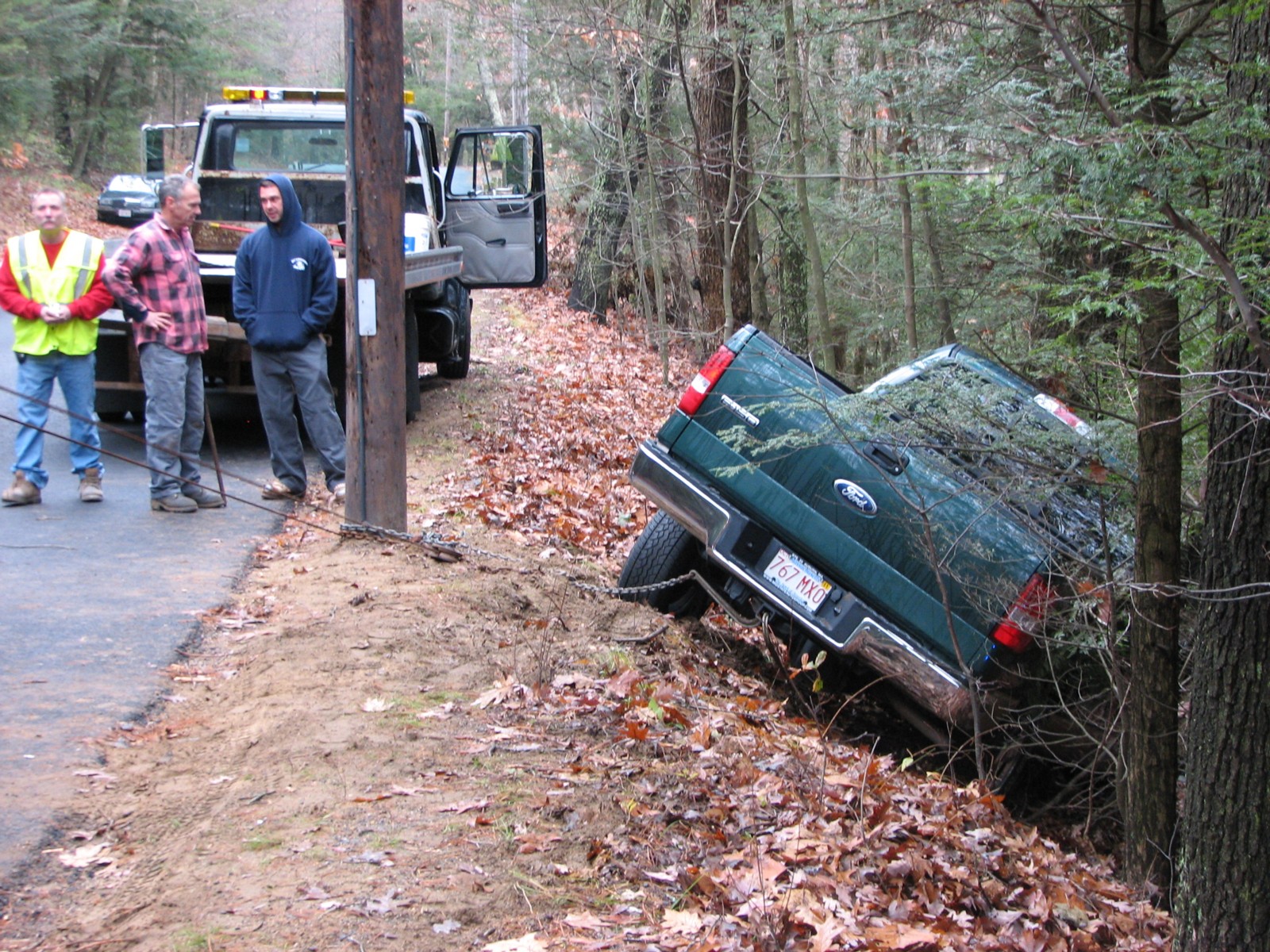 A deer jumped out of the woods in front of Ted’s pickup truck. Ted’s maneuver to avoid the deer got out of control and he ended up against a tree. Ted fortunately avoided an utility pole just by inches.