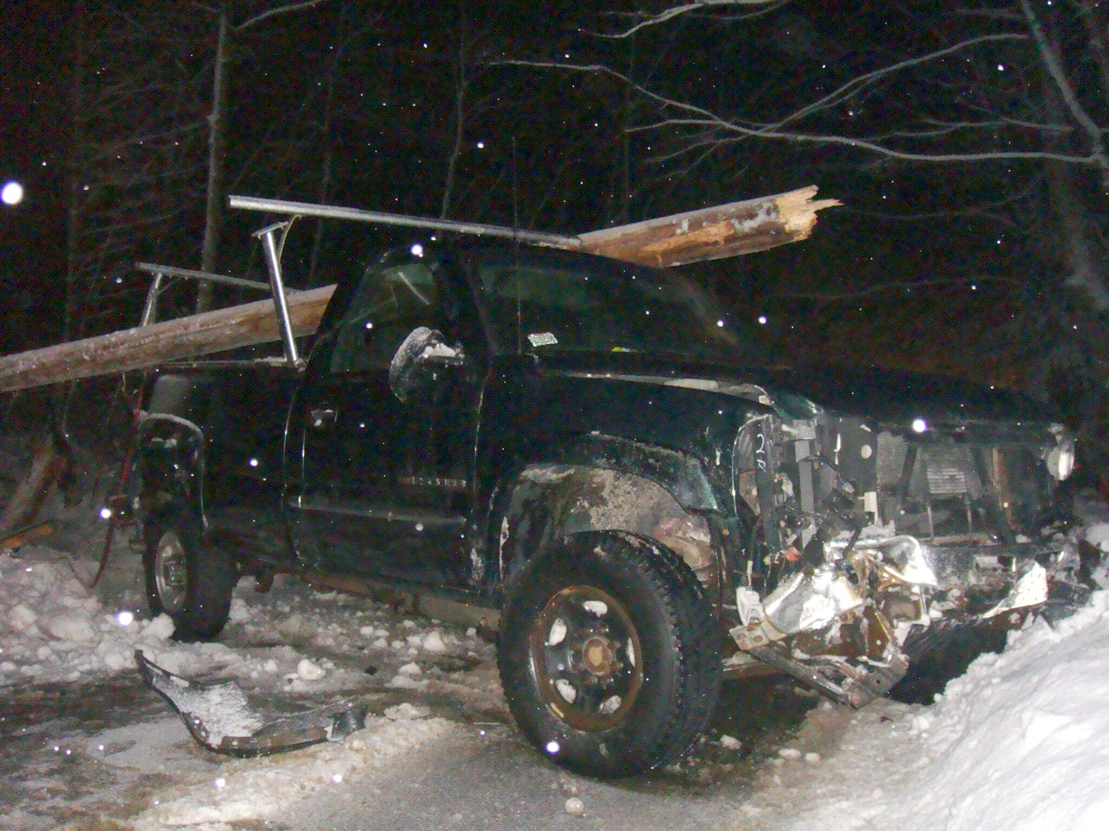 Crashed-pickup-truck-on-Leon-Road Around 6:15 p.m. this evening, Friday 26, 2010, a black pickup truck was driving towards Holland on Leno Road just at the town line coming from Sturbridge. In a slight left curve the driver lost control and crashed into the telephone pole. The telephone pole broke in half on impact and the power lines and the transformer crashed to the ground. The telephone pole ended up on top of the pickup truck.