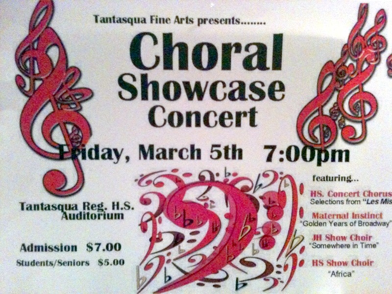 If you don't have any plans for tonight, Tantasqua Fine Arts presents the Choral Showcase Concert at 7 p.m. at the Tantasqua Regional Highschool.