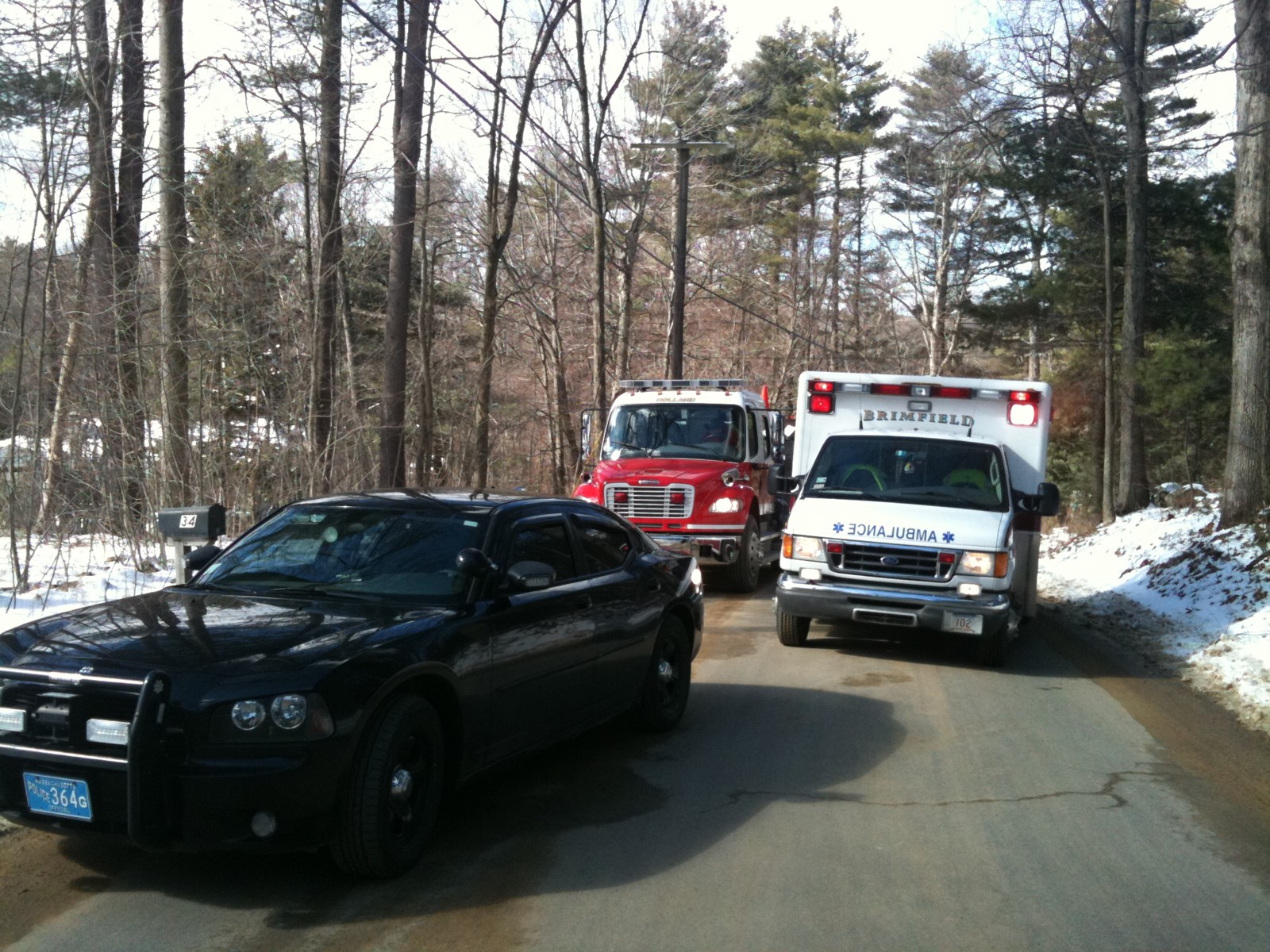 The Brimfield Ambulance, Holland Fire Department, Holland Police, and State Police were dispatched to the intersection of Leno Road and Kimball Hill Road. The man was walking along Leno Road. Leon Road was blocked for about 10 minutes while acting Chief of Police Brian Haughey and the EMT’s were inside the ambulance attending to the man. I left before the State Police arrived on the scene.