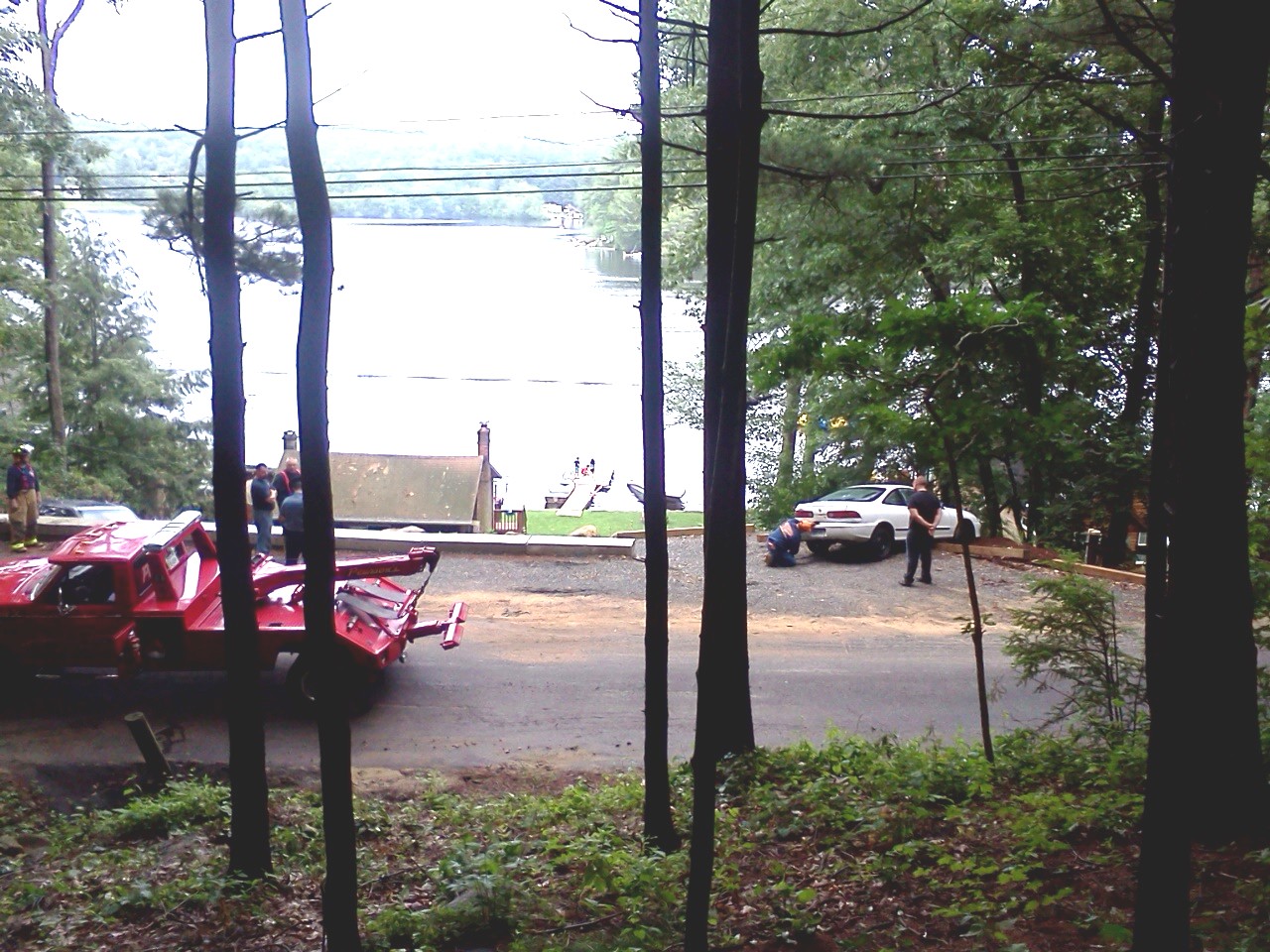 Appears Acura driver had trouble turning around in a driveway at about #46 Over The Top Road last night in the heavy downpour. Got stuck on the edge of a steep hill heading towards the lake.