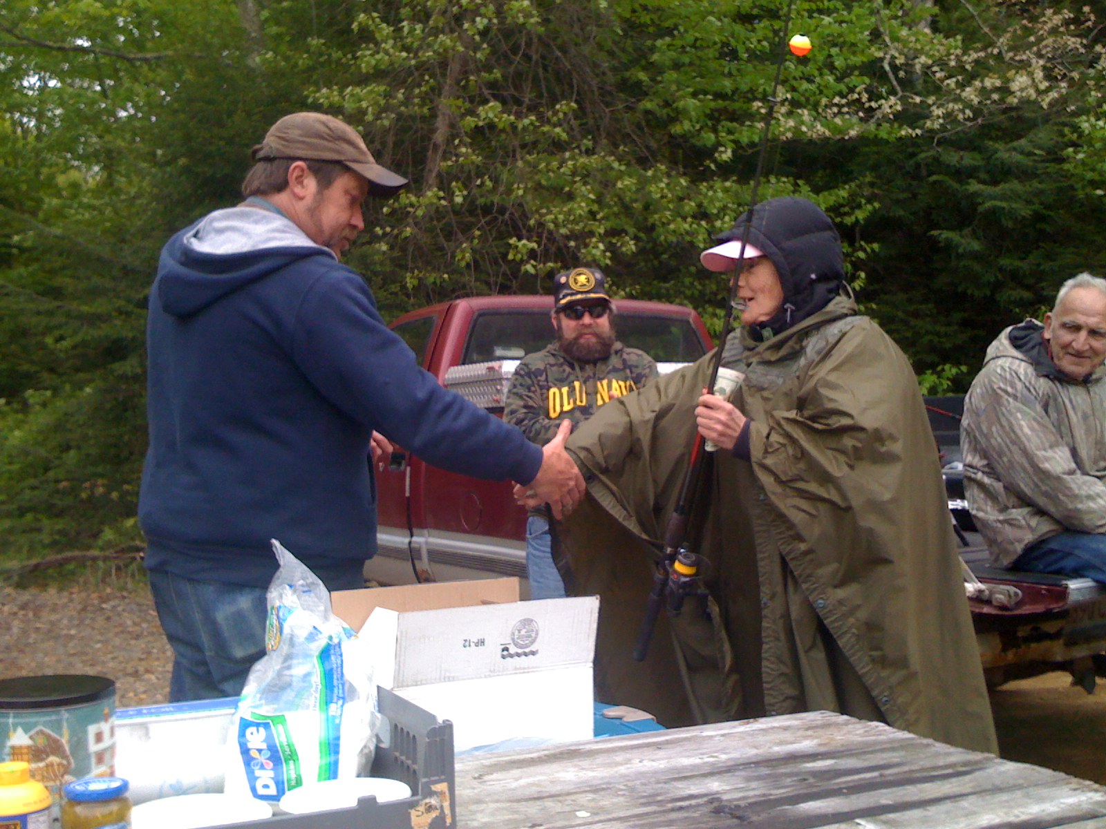 It wasn‘t the perfect day to attend a fishing derby. The Holland Rod and Gun club attracted 28 participants who paid the $10 fee to participate. Not a fisher myself, I learned by talking two a group of young men from Palmer that they saw it as an opportunity to “get away from their ladies” for the day. At the end however, the “ladies” beat the guys as the reader will learn. The nice setting of the Holland Rod and Gun club located on Union Road features its own pond around which the fishers launched their bait.