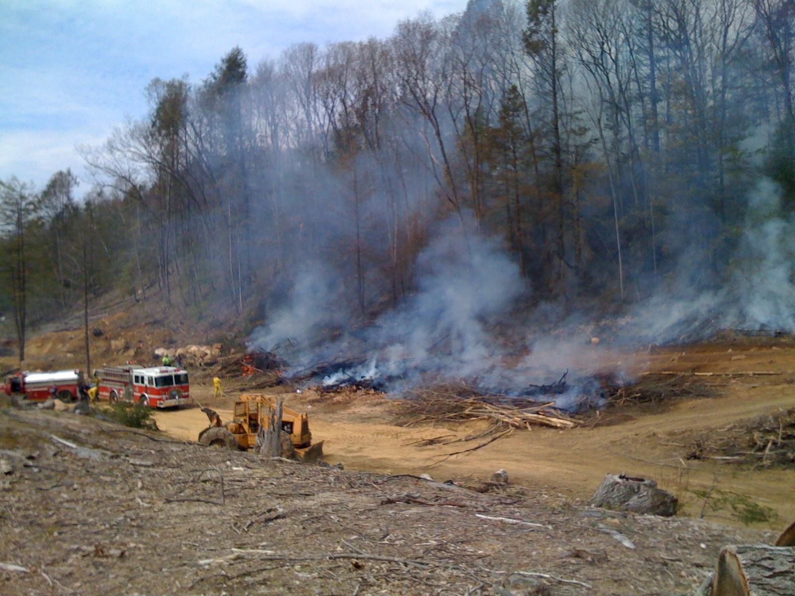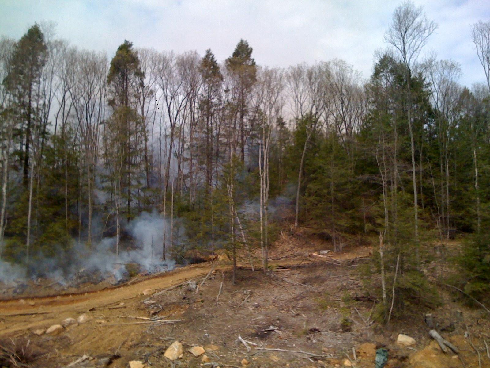 Time stamp: 2008-4-26, 11:27:49AM. There are three piles of brush, the pile on the very left is still burning. Airborn ambers set the hill behind the burning brush piles an fire.