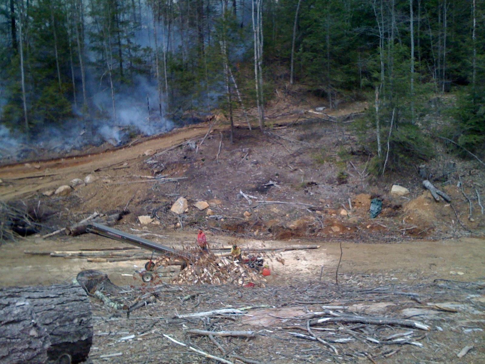 Time stamp: 2008-04-26, 11:27:59AM. Smoldering hill already extinguished, the road in the upper half of the image is the steep access road to the plateau shown in picture no.6; the road in the lower part of the image leads to corner of Chandler and Chaffee road. Two farmhands are splitting wood with a gas powered wood splitter right next to a gas powered conveyer belt to load the fire wood on Mike’s red truck for delivery; yes, some people heat their houses with wood and Mike and his farmhands supply the wood to these people. Wood by the way is a also a farm product according to the laws of the Commonwealth.