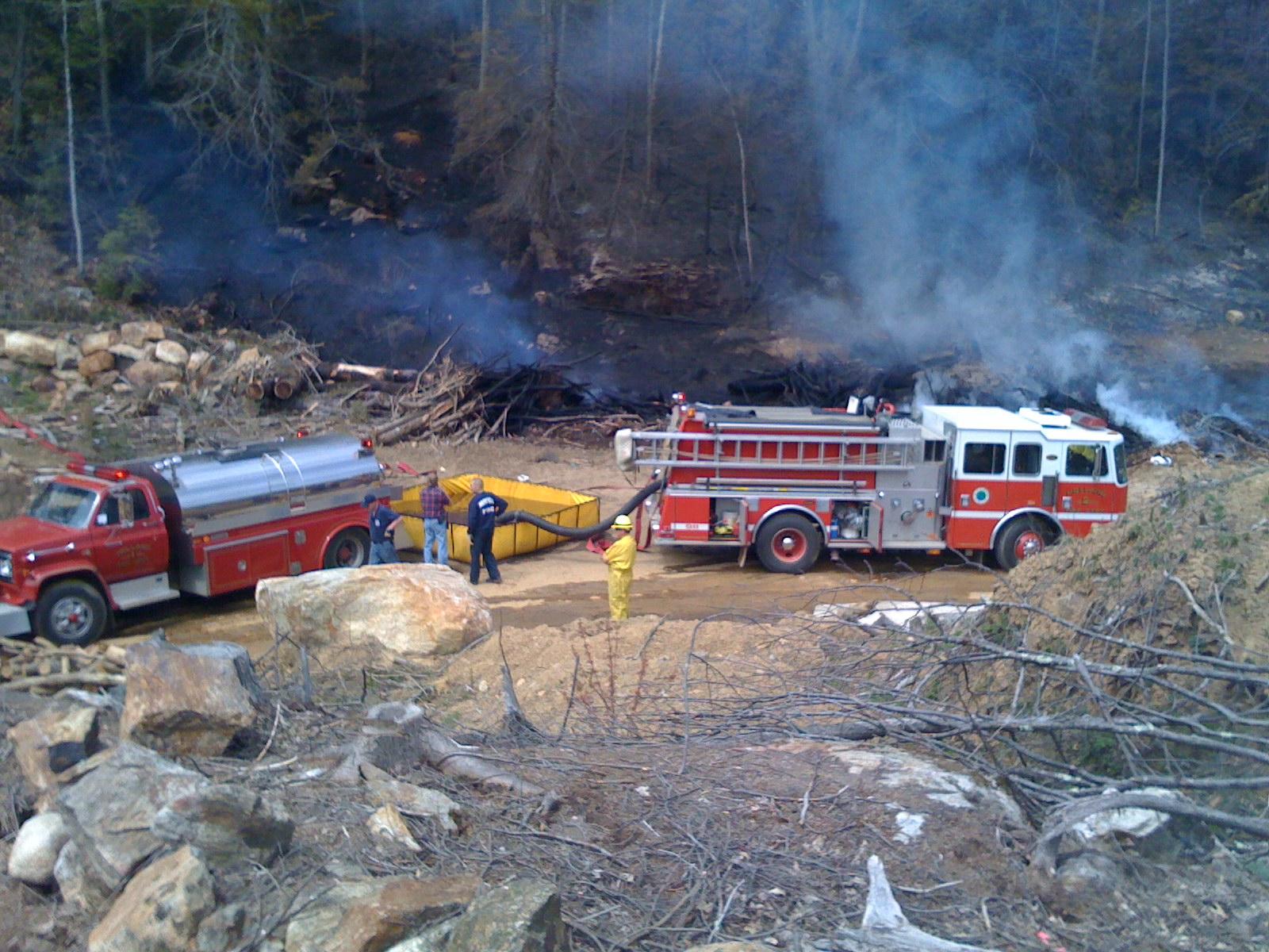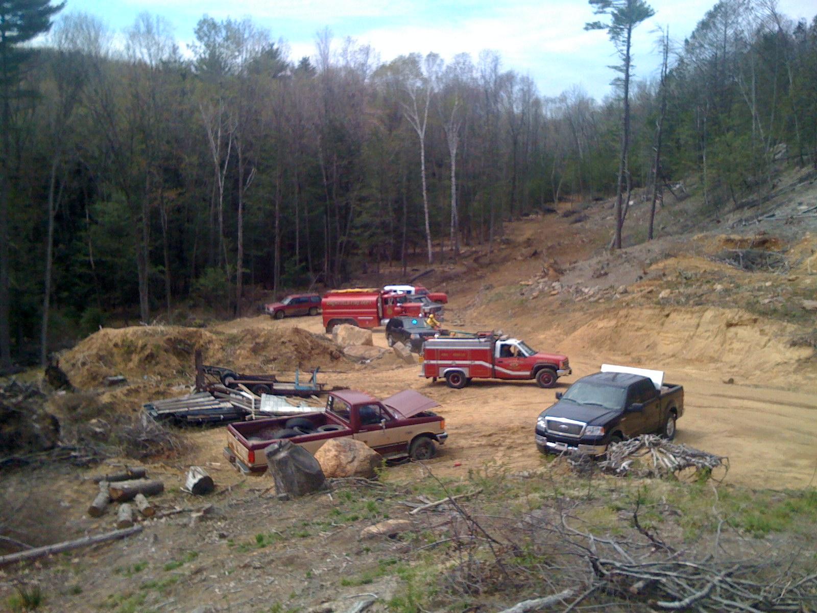 Time stamp: 2008-04-26, 11:30:24AM. A fire truck on its way delivering water that was emptied into a folding pool shown in the next picture. This view is towards south-east, the reader can clearly see the clear-cut area along Abmber brook where houses are. The scorched area is well to the north and no houses were in danger as one comment falsely states, (The fire was racing up the hill towards the homes that abudt your [North East Concept’s property that is, not LaMountain’s] property!).