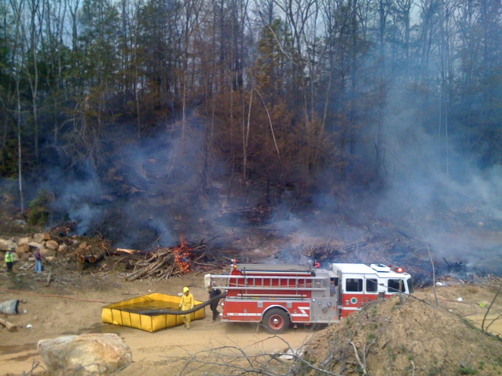 Time stamp: 2008-04-26, 11:30:39AM. One brush pile still burning. The picture also shows fire fighting personnel and the folding pool right next to the fire-engine.