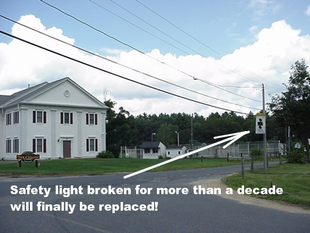 According to James Wettlaufer, Kristin LaPlante worked on getting a grant to replace the broken security light in front of HES driving eastbound which has not been working for around 10 years. A “Concerned Citizen” sent a letter to the Holland Blog which was published on this blog on March 20, 2009 under the title Broken Light Safety Issue. Within 60 days the town will get grant money to fix the light and remove the safety hazard. The new light will be powered by a solar panel. According to Wettlaufer, the old sign was not reparable. Wettlaufer allegedly got this response from three independent companies.