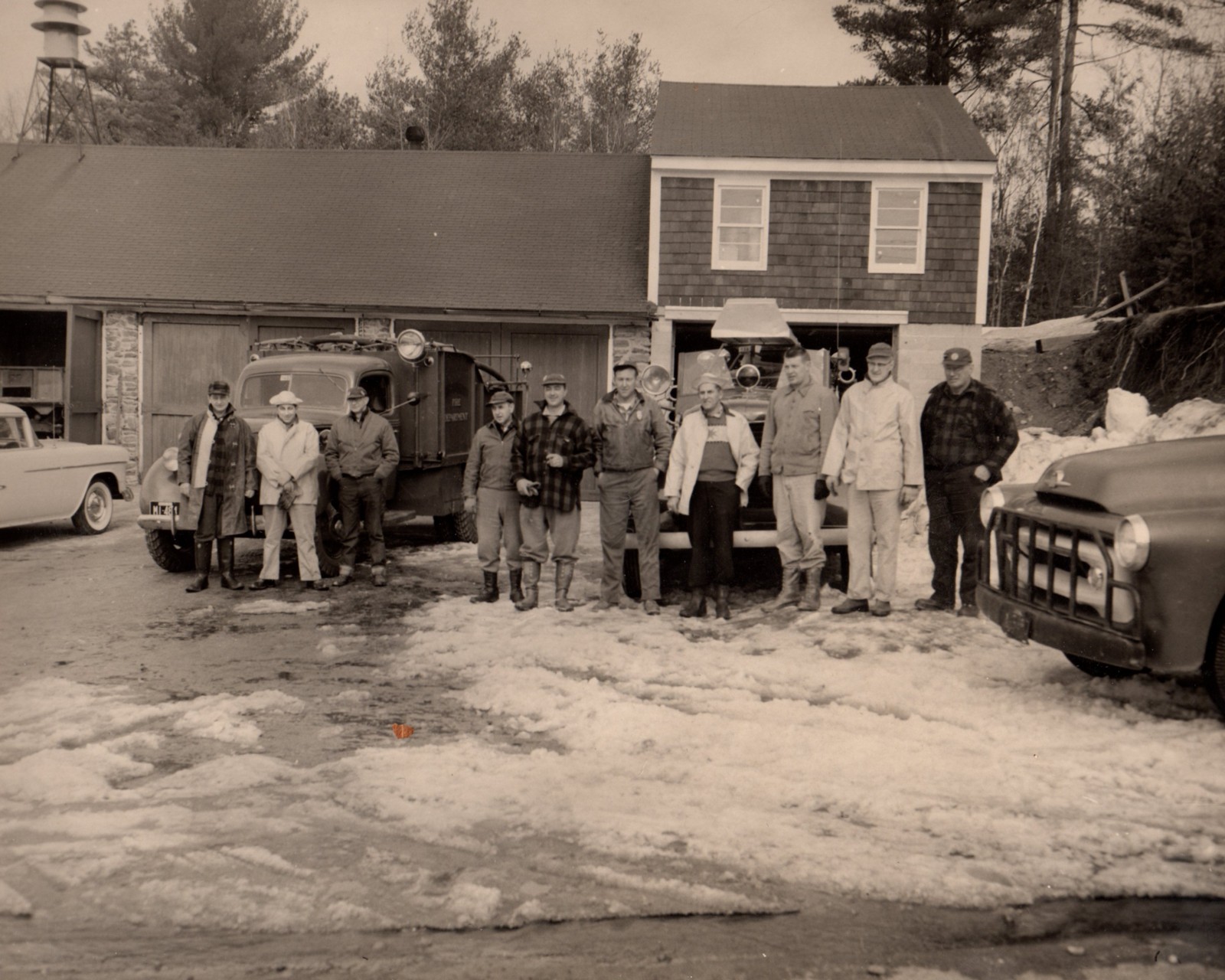 In the picture above is the old Holland Fire Station shown. The old Holland Fire Station and the addition shown here, and even the pump truck on the left behind the three men were all built by town volunteers. Individuals from left to right; Bob Wilson, Dom DiPaolo, Joe Nitka (or Charlie Vogel), Al Menard, Al Montville, Fire Chief John Goodhall, Pete Bishop, Bill King, Gerry Germaine, Charlie Bennett.