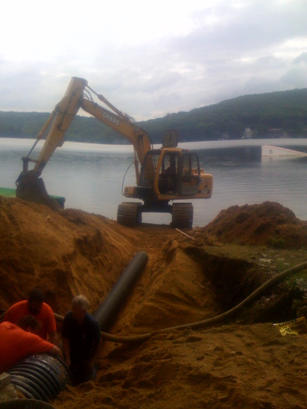 Back in late June and into July, Brian Johnson’s Highway Department replaced the drainage pipe leading from the parking lot on the south side of PJ’s underneath Mashapaug Road to Hamilton Reservoir and also installed a catch basin.