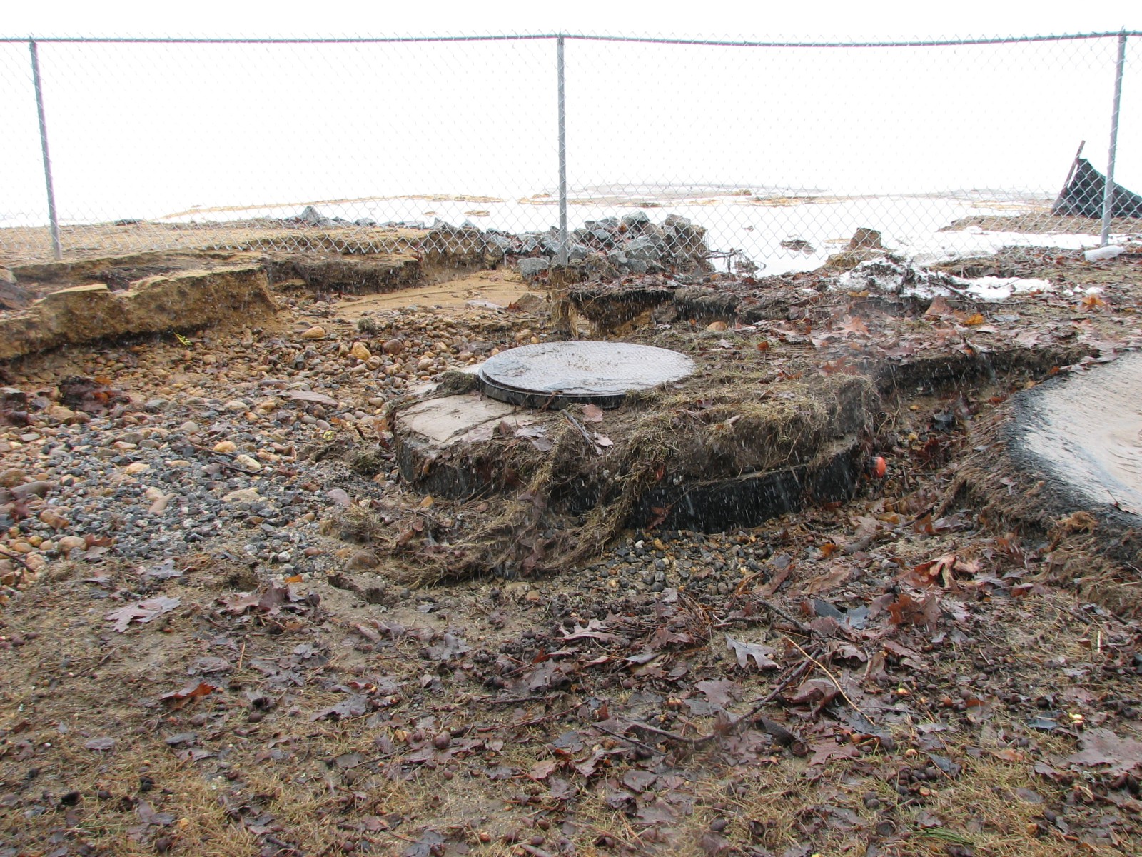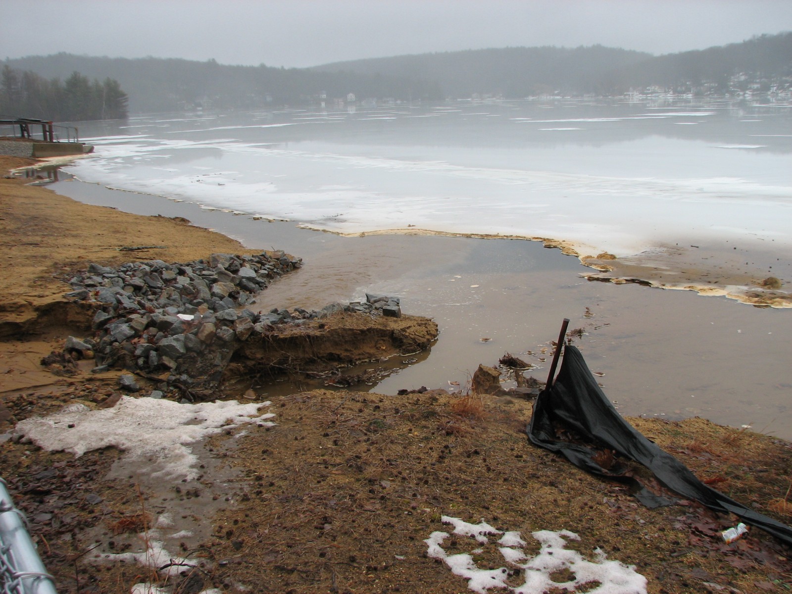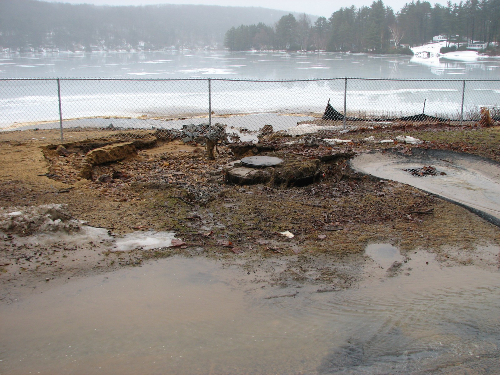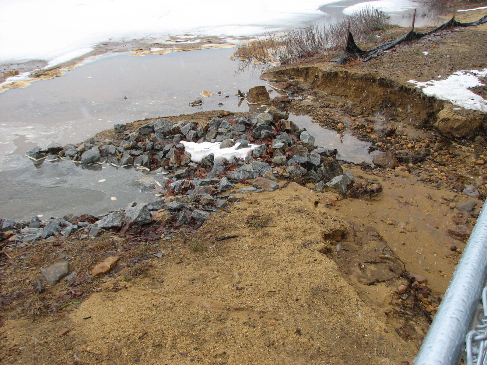 Was the System adequate or not? Was the size of the drain shown to the right in the picture below too small or to big? The water rushed out of the paved spill way on the right causing a little canyon leading around the pipe opening at the water’s edge.