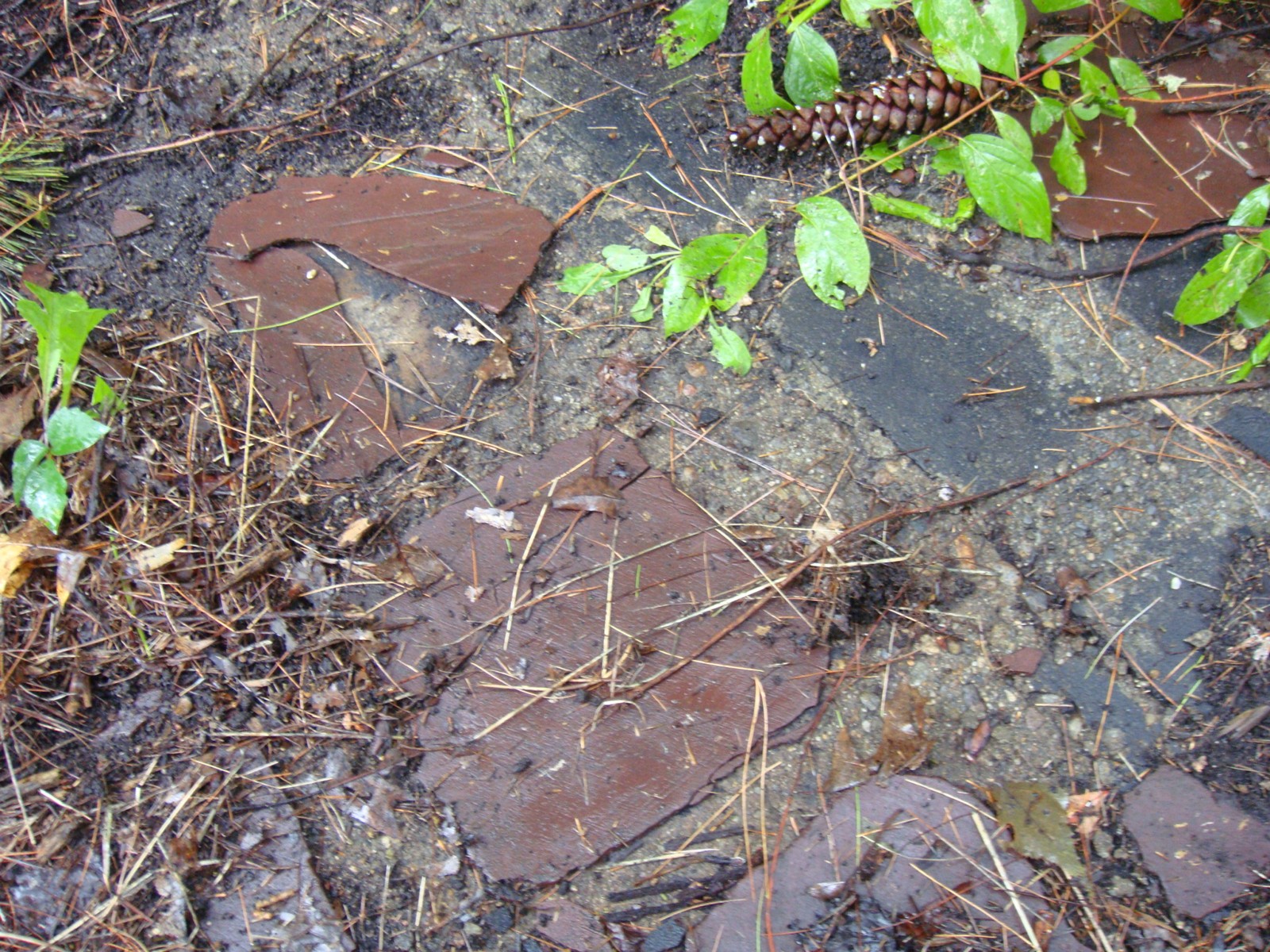 The picture on the left shows part of the foundation of the house pictured above. Considering the size and location of the slab, it could have been the base of the chimney visible in the picture above. There are also some electric wires with the old fashion aluminum sleeve visible.